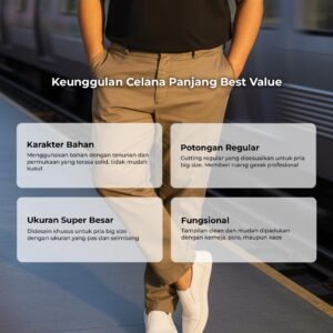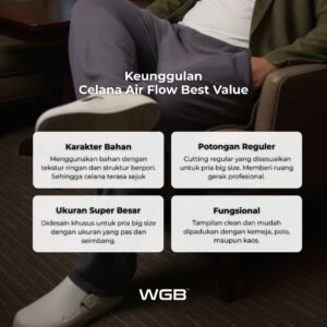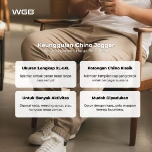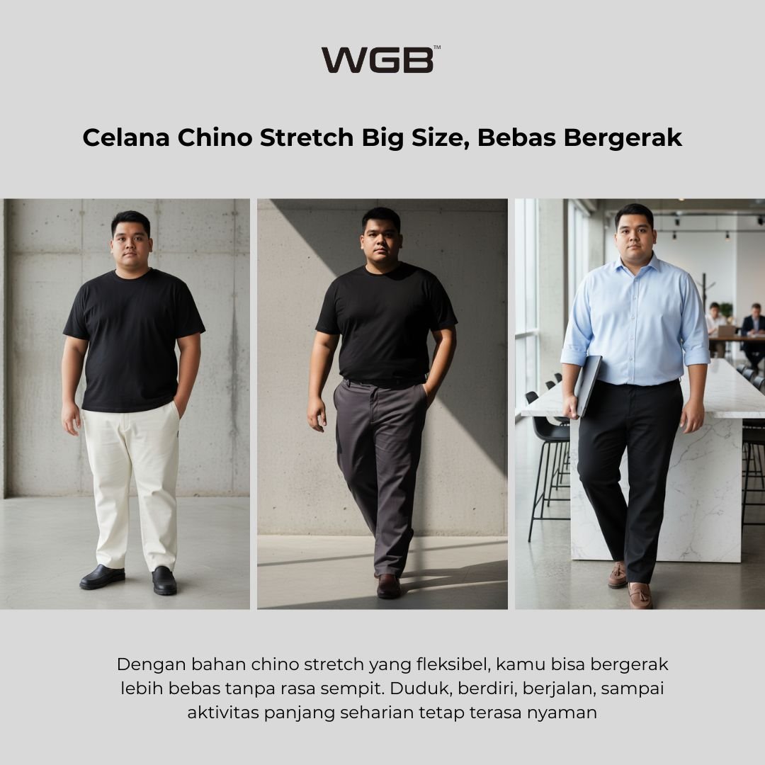 WGB Chino Premium Stretch dirancang khusus untuk pria big size yang ingin tampil rapi, adem, dan bebas bergerak. Menggunakan bahan katun stretch premium yang mengikuti gerak tubuh tanpa terasa ketat, memberikan kenyamanan ekstra untuk aktivitas seharian.