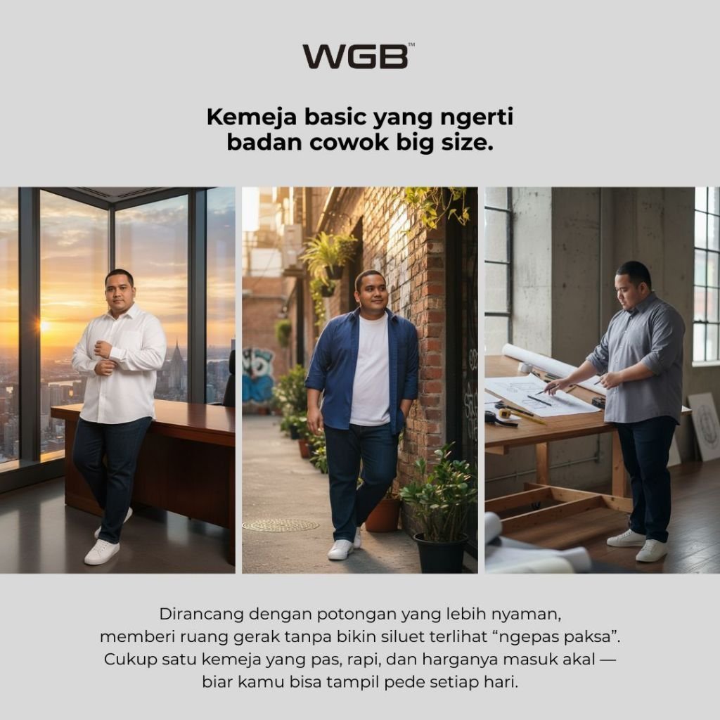 Lini pakaian big size dengan harga terjangkau Untuk pria Big Size yang ingin tetap tampil percaya diri di setiap kesempatan tanpa ribet dan tetap hemat! Kemeja WGB Best Value hadir untuk kamu yang ingin tampil rapi, adem, dan praktis setiap hari. Menggunakan bahan CoreBlend Fabric yang memadukan kenyamanan katun dan kekuatan polyester, membuatnya ringan, adem, dan tidak mudah kusut.